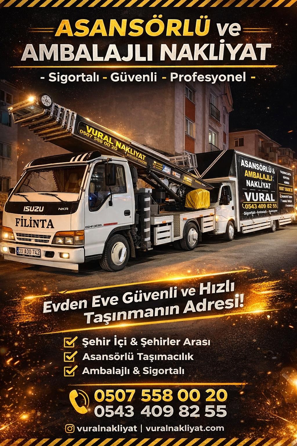 “Sizi şehir içi ve şehirler arası taşımacılıkta güven, hız ve profesyonellik bekliyor. Vural Nakliyat, paketleme, sigortalı taşıma ve zamanında teslimat ile taşınma deneyiminizi kolaylaştırır. Müşteri memnuniyetine odaklı hizmetimiz sayesinde her adımda stressiz ve güvenli bir taşınma süreci yaşarsınız.”